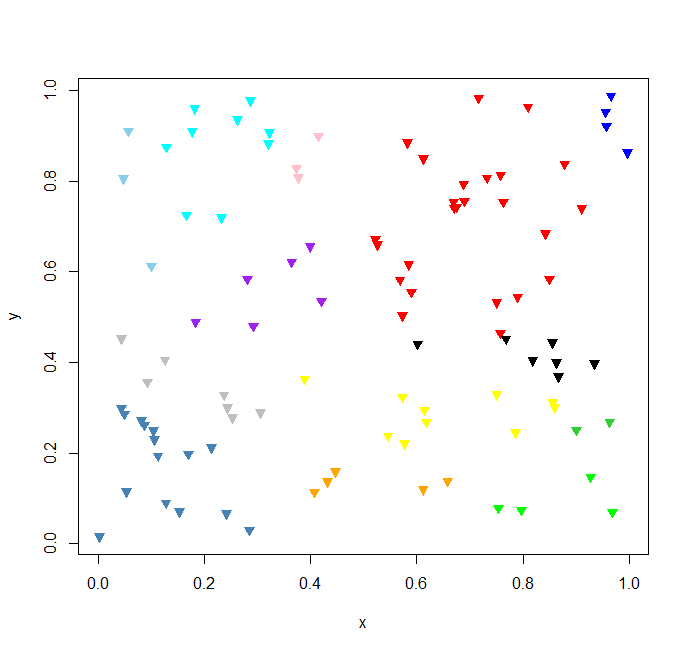 然后我们就可以根据欧几里得距离计算出任意两个坐标点之间的距离。假设我们以0.3作为距离的阈值,即小于0.3的距离,就认为两个坐标点是在同一个地方的。所以我们就可以根据这个规则写出下面的索引函数,然后我们就可以将二维坐标点和上面的索引函数传递进入二叉树聚类函数之中了: