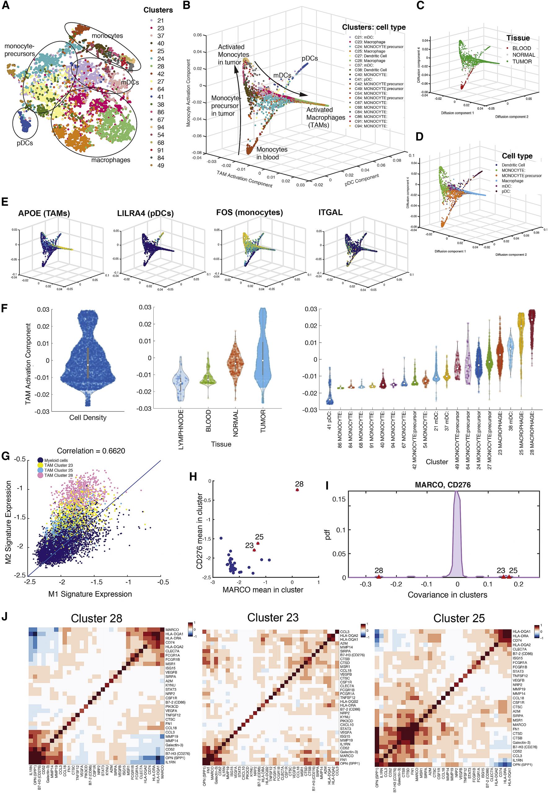 - (J) Heatmaps showing covariance patterns of select macrophage marker genes in 3 TAM clusters.