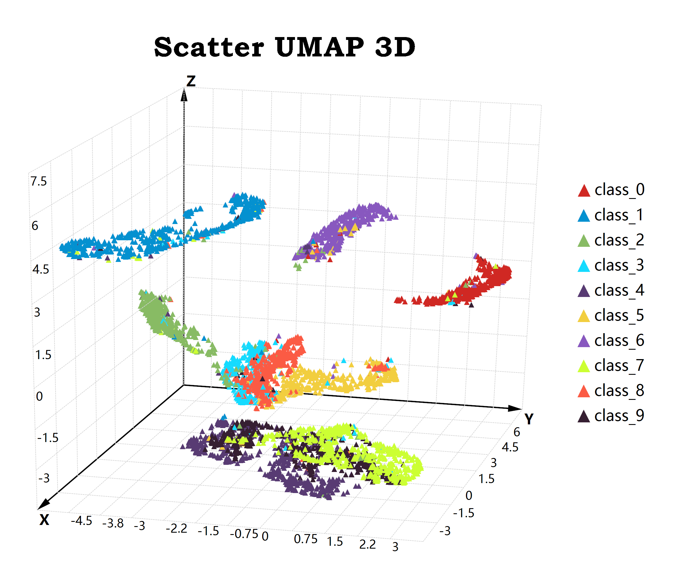 在进行三维散点图的可视化代码以及实现原理讲解之前,我们首先需要获取得到进行DEMO用的数据源进行测试。在这里我们使用之前进行UMAP降维方法所演示的MNIST数据集的三维降维结果来进行DEMO展示。在这里我们回顾一下进行三维的UMAP降维的脚本代码:R#