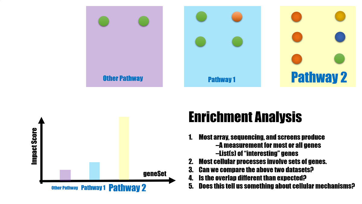 这样,得到这两组数据后,我们所分析的不是单个基因表达的差异,而是箱子与箱子之间的差异。由此,我们得到的数据更容易解释。进行基因富集计算分析,我们一般会需要完成下面的几个步骤: