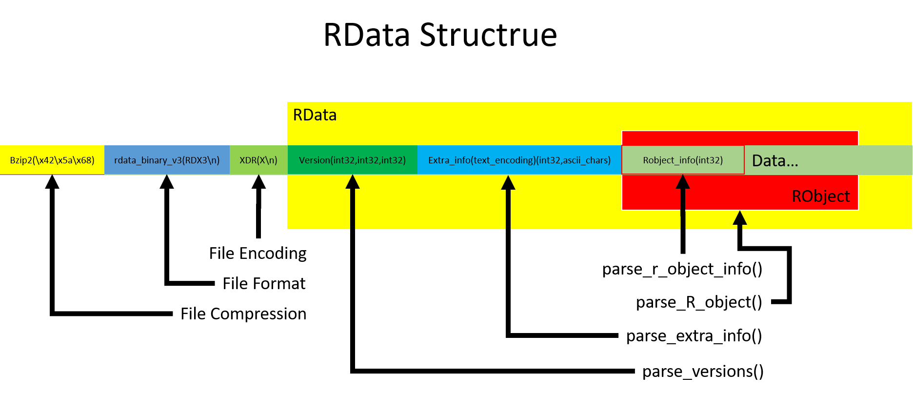 XDR编码方案是 1987 年 6 月由 Sun Microsystems,Inc. 编写的 RFC 1014中描述的外部数据表示标准(External Data Representation)。XDR提供了一种与体系结构无关的表示数据,解决了数据字节排序的差异、数据字节大小、数据表示和数据对准的方式。使用XDR的应用程序,可以在异构硬件系统上交换数据。由于RData文件采用XDR编码,了解XDR的基本规则对于解析至关重要: