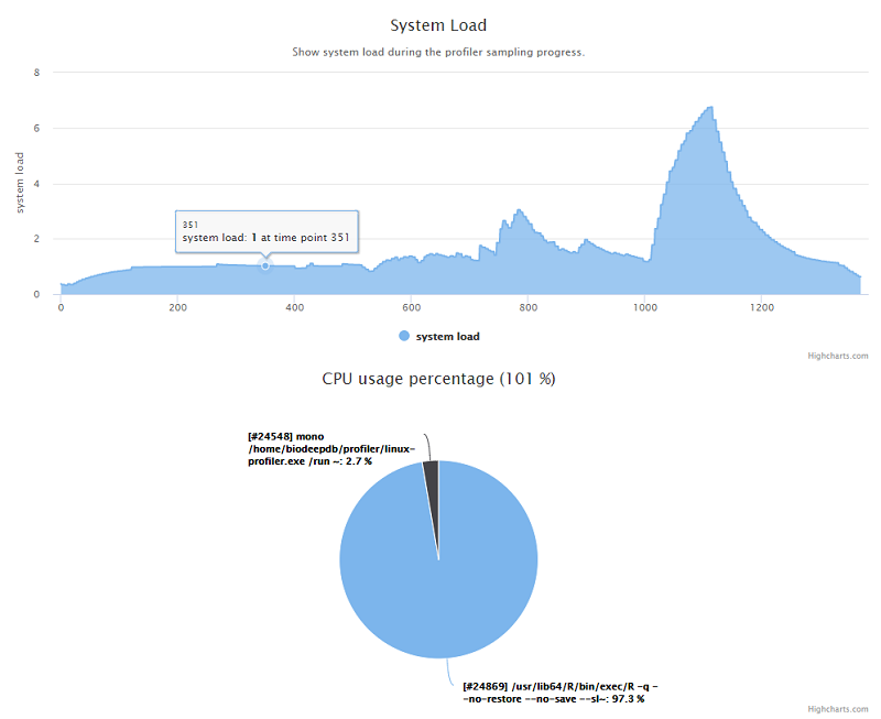 那有了上面的存储数据的js文件之后,我们就可以使用进行性能数据的可视化了。我们将每一个时间点的性能统计数据对时间点作图,就可以得到系统的性能曲线,也可以使用highcharts.js显示出每一个快照时间点上的进程间的CPU利用率的分布到一个饼图。使用highcharts.js进行对应的数据可视化,大家可以上highcharts.js的官网,阅读和修改相关的demo教程代码,就可以很轻松的实现了。highcharts.js