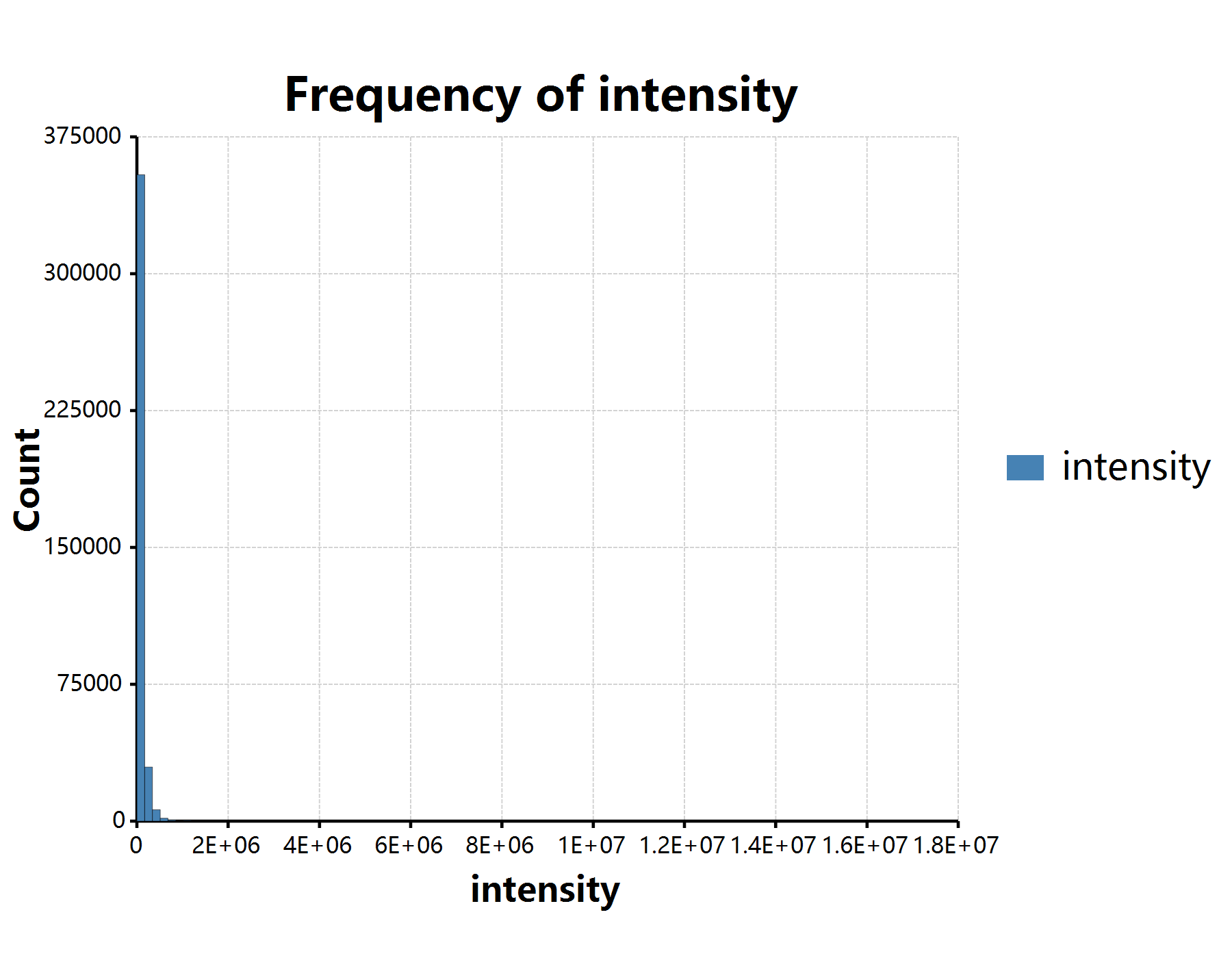 首先我们来查看质谱成像的原始信号值的分布一般是怎样的。我们先通过mzkit程序包所提供的质谱成像相关的函数进行响应度值的获取,接着呢,就可以通过直方图来简单的查看信号值的分布情况: