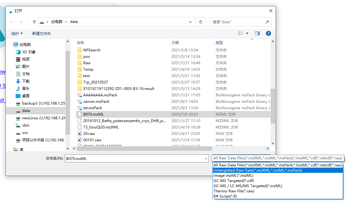 在mzkit软件之中,几乎支持所有主流的开源原始数据文件格式,以及赛默飞的Raw文件,还有一个就是诺米代谢我们自家的mzPack原始数据文件。在这里,我们选择一个mzML格式的原始数据文件,然后点确定打开这个文件。