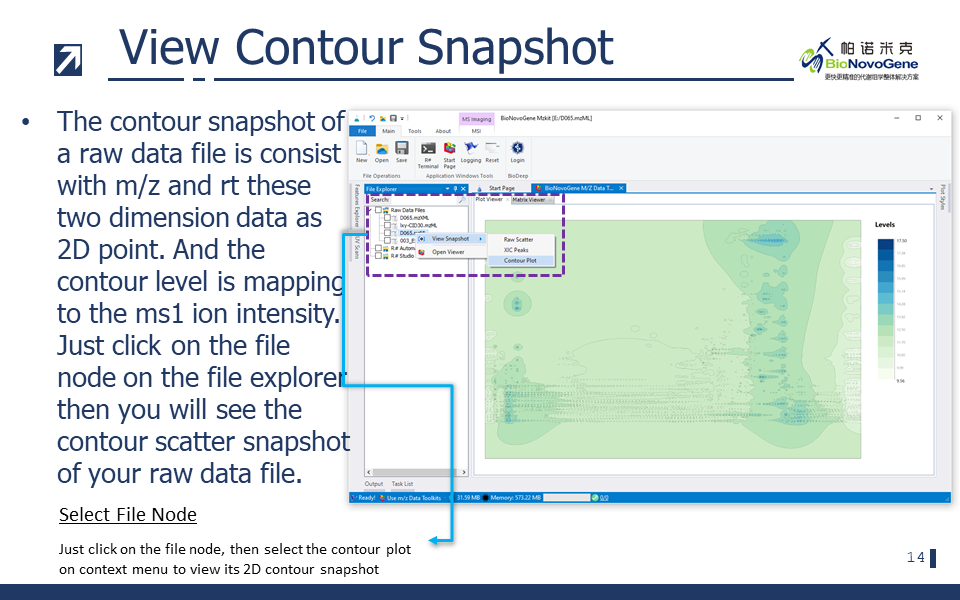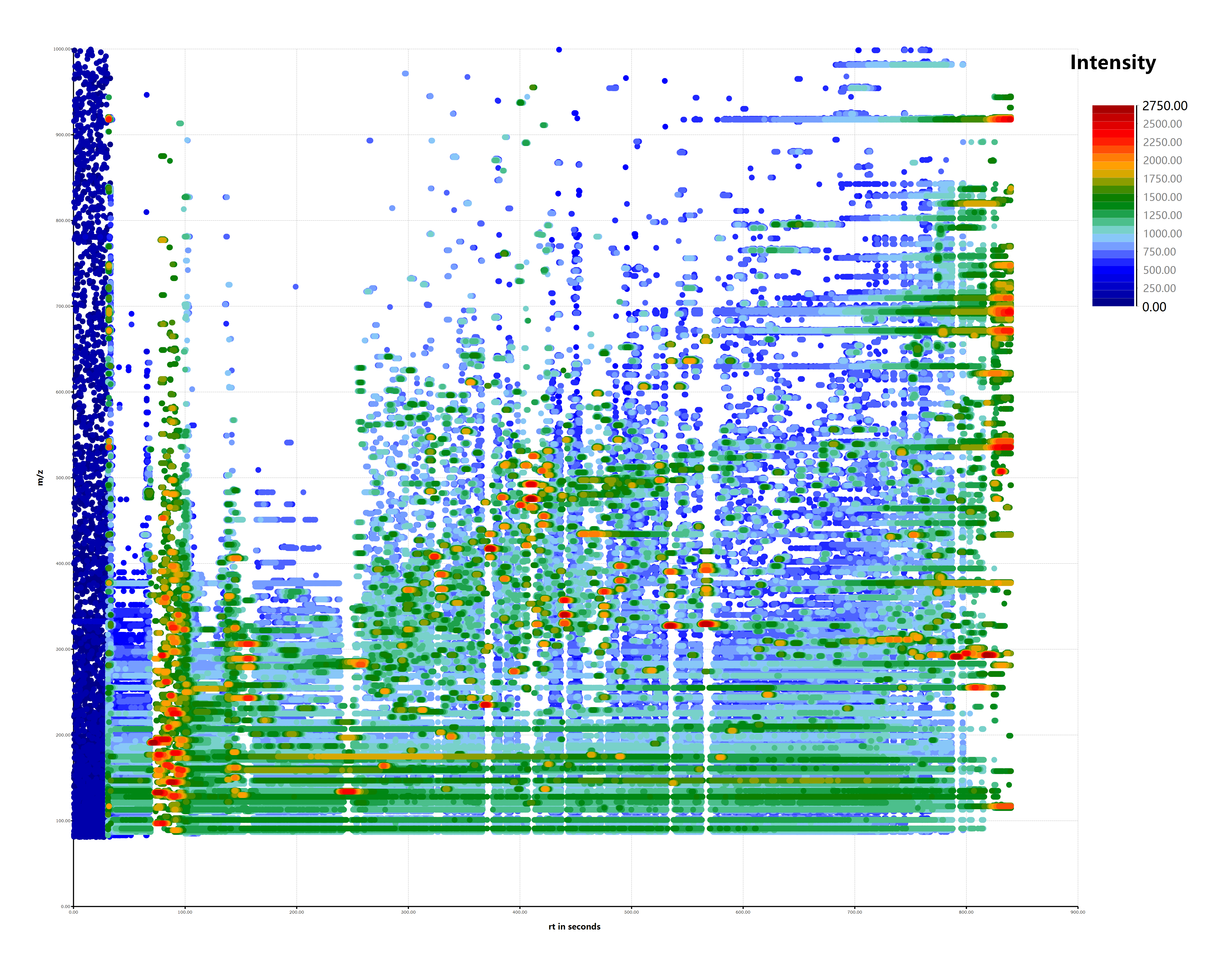 - 【等高线图】等高线图所表达的含义与上面的两种可视化图是一致的,也是将[scan_time, m/z]作为二维坐标点,intensity值作为mapping的对象来产生等高线。对于等高线图,其不仅仅类似于散点图显示出了离子的分布情况,还比散点图多了一层离子分布密度信息