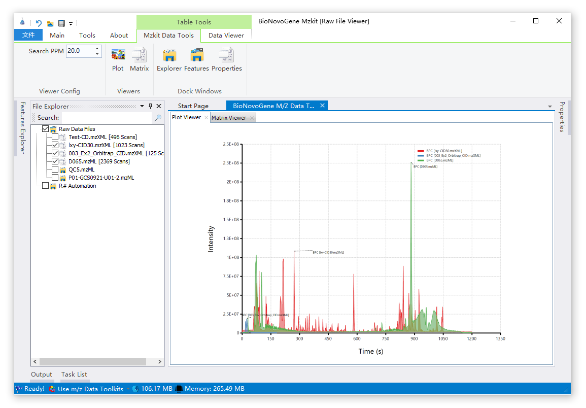 […] 上面所描述的非靶向混合数据,在每一个保留时间点上其各自的检测信号相互叠加在一起,产生了TIC色谱图。对于TIC色谱图的含义,我们大致可以理解为,每一个时间点上质谱仪所扫描到所有离子信息的信号总和对时间作图。我们可以首先在这里通过MZKit软件查看一个非靶向原始数据的TIC谱图,其一般大致是一个波形非常复杂的信号图: […]