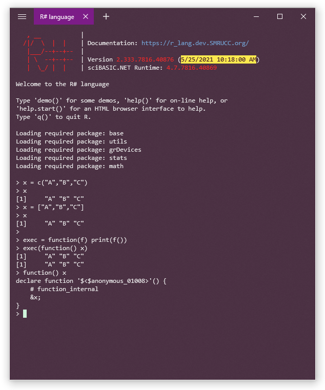 在R#中执行上面的代码,发现虽然实现的功能与在R语言中是一样的。但是函数的申明的输出却差异很大。产生这个差异的原因就是R#语言将function作为一个关键词,而非像R语言一样作为一个函数名来使用。因为在R#之中,任何对象都要有一个符号名称,对于诸如function() x这样的申明形式,因为没有对应的符号名称,所以R#环境自动为这个值分配了一个匿名符号。