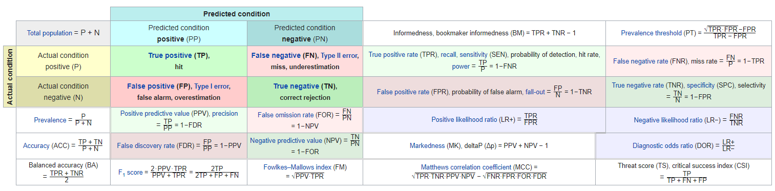 对于一个二元分类问题,我们只能够预测目标为目标分类或者不是目标分类,所以我们可以根据分类结果得到一个表格: