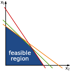 图中的彩色线段为约束条件,这些线段所围成的一个多边形为可行解。这个图中所示的变量只有[x1, x2]两个变量的线性规划问题。