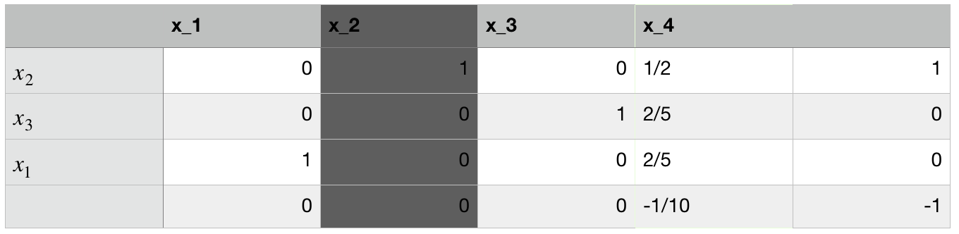 • 数学原理:为了使新的基变量 x_k 在其所在的行(第 i 行)的系数变为1,我们将整个第 i 行的方程两边同时除以主元 a_ik。