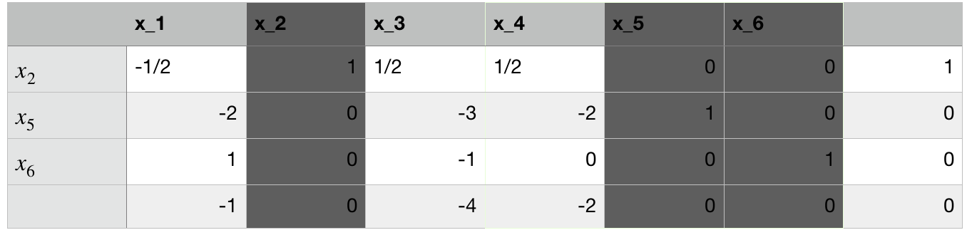 - 数学原理:为了使新的基变量 x_k 在其所在的行(第 i 行)的系数变为1,我们将整个第 i 行的方程两边同时除以主元 a_ik。