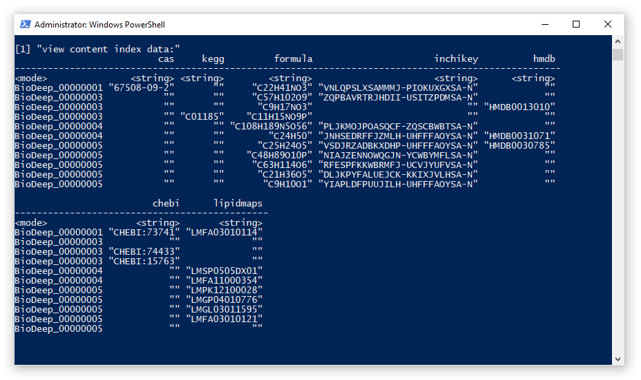 index = dataset[, ["cas", "kegg", "formula", "inchikey", "hmdb","chebi","lipidmaps"]];