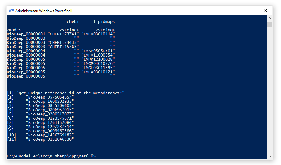 现在假设我们已经将代谢物注释信息图数据库导出为如上所示的一张二维表之后,我们就可以根据特定的列数据进行代谢物注释信息的唯一哈希值的计算操作了。下面使用R#脚本代码来为大家演示整个计算过程: