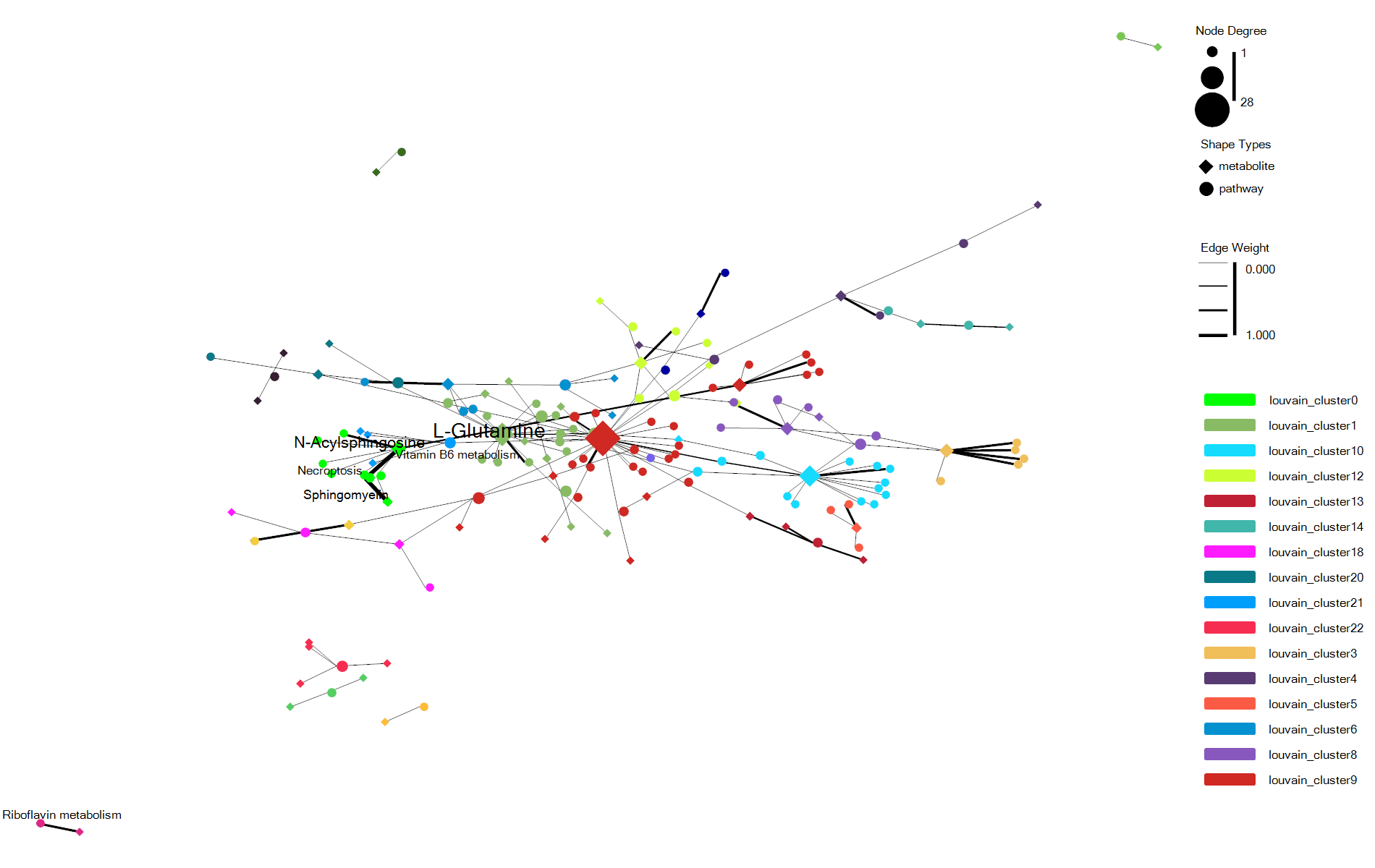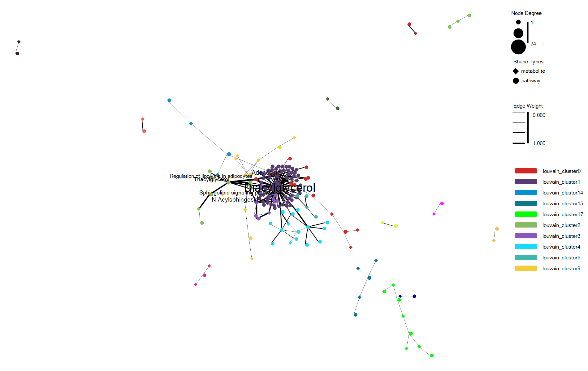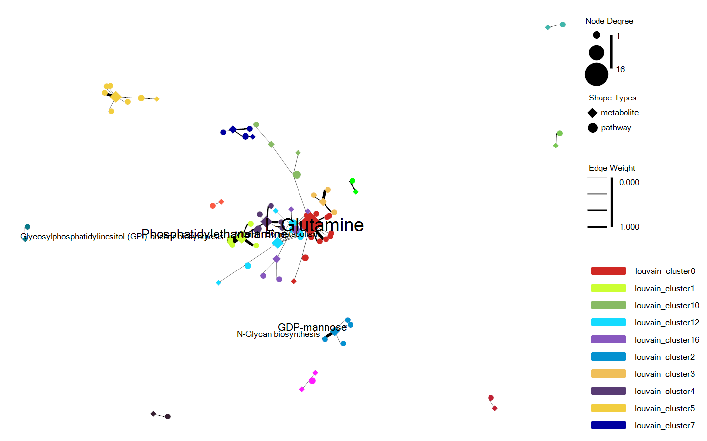 - shape 可以将不同类型分组的网络节点设置为不同的形状,例如pathway类型的节点设置为圆圈,metabolite类型的节点设置为菱形