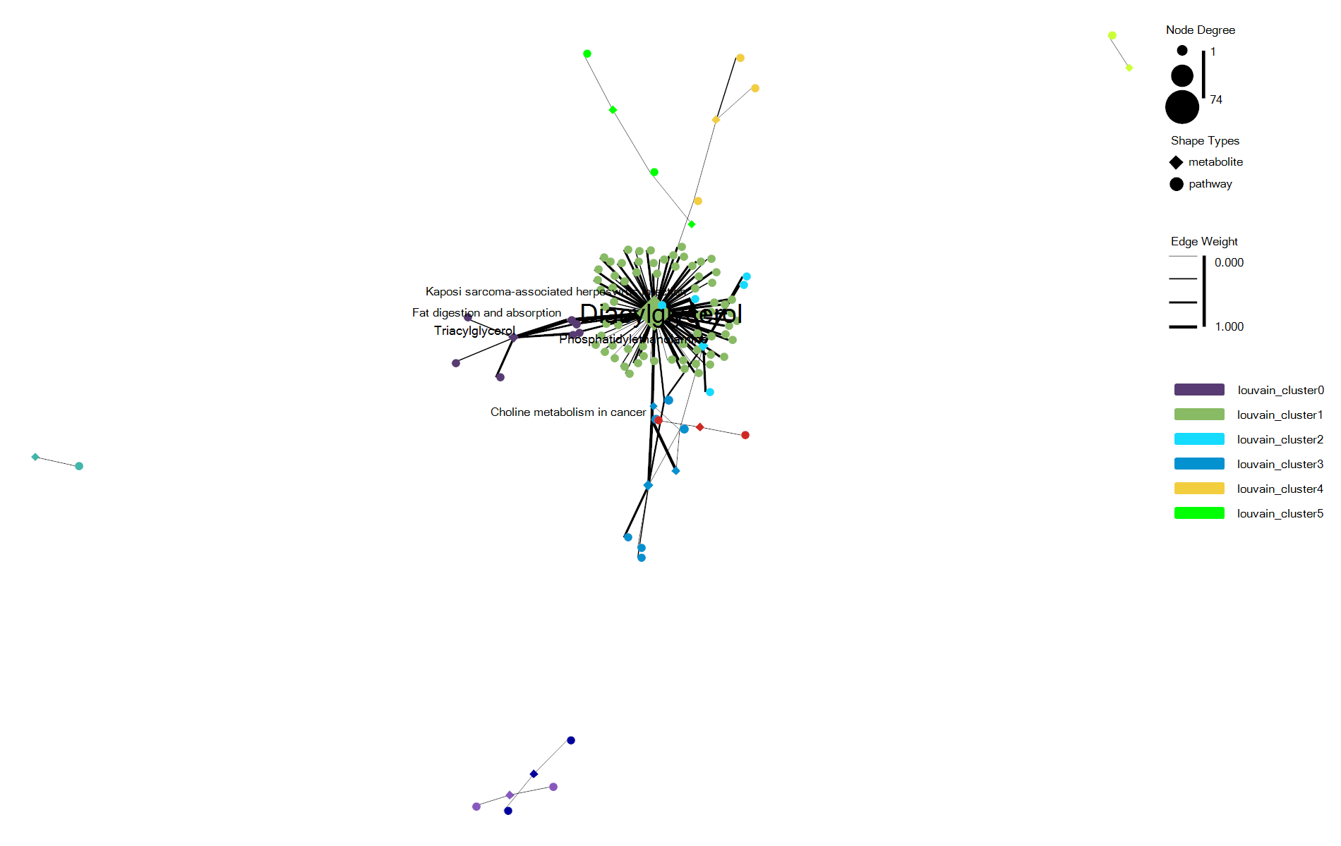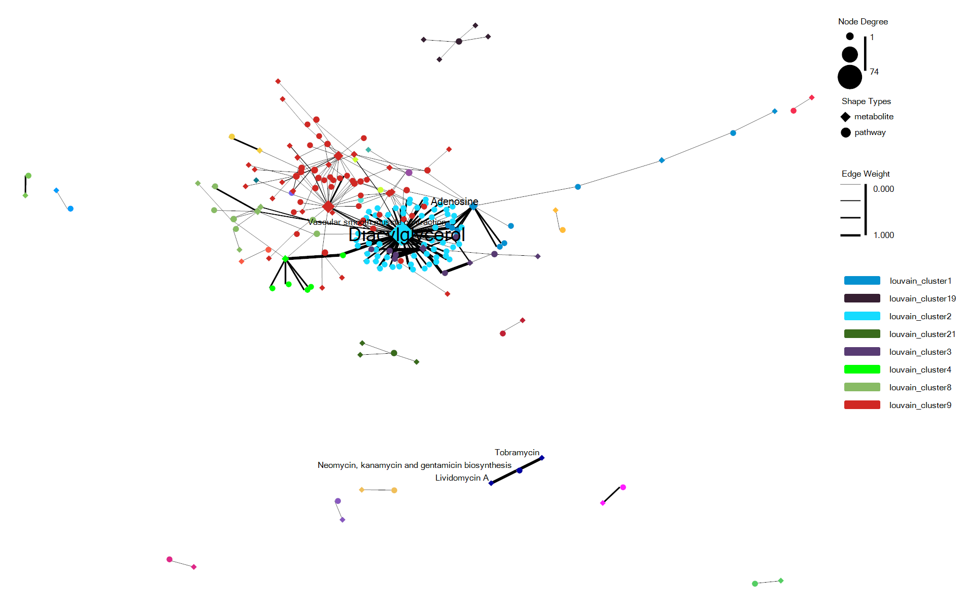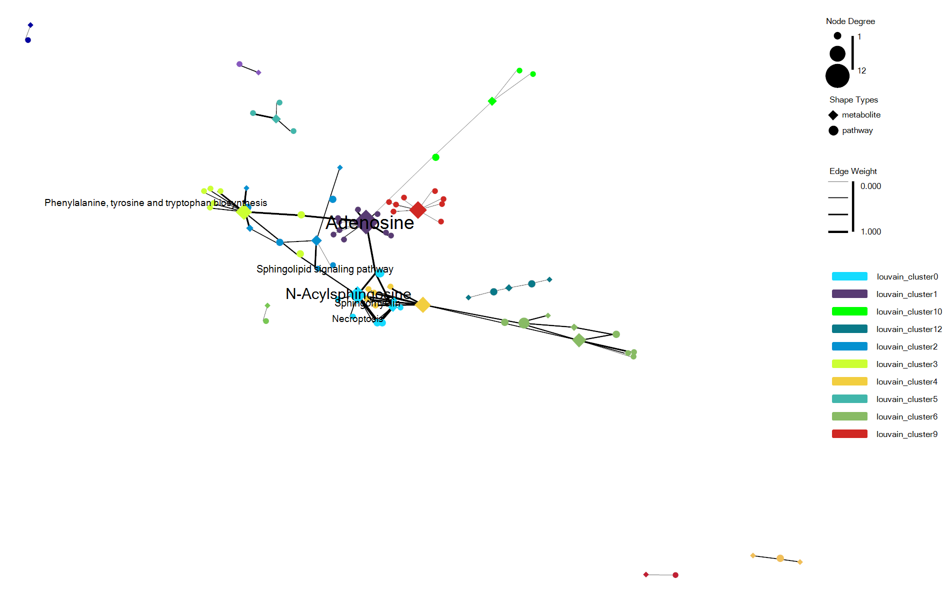 - shape 可以将不同类型分组的网络节点设置为不同的形状,例如pathway类型的节点设置为圆圈,metabolite类型的节点设置为菱形