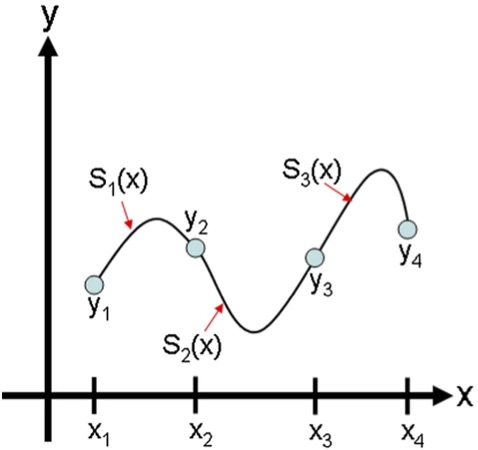 在颜色插值计算过程之中,我们一般是可以通过三次样条(cubic spline)插值的方法来从基础的颜色板上获取一个连续的颜色谱。三次样条插值(Cubic Spline Interpolation)简称Spline插值,是通过一系列形值点的一条光滑曲线,数学上通过求解三弯矩方程组得出曲线函数组的过程。下面我们来讲解一下通过三次样条插值来生成连续的颜色谱的具体原理。在讲解颜色插值计算之前,我们先来看一下一个简单的三次样条插值的示意图: