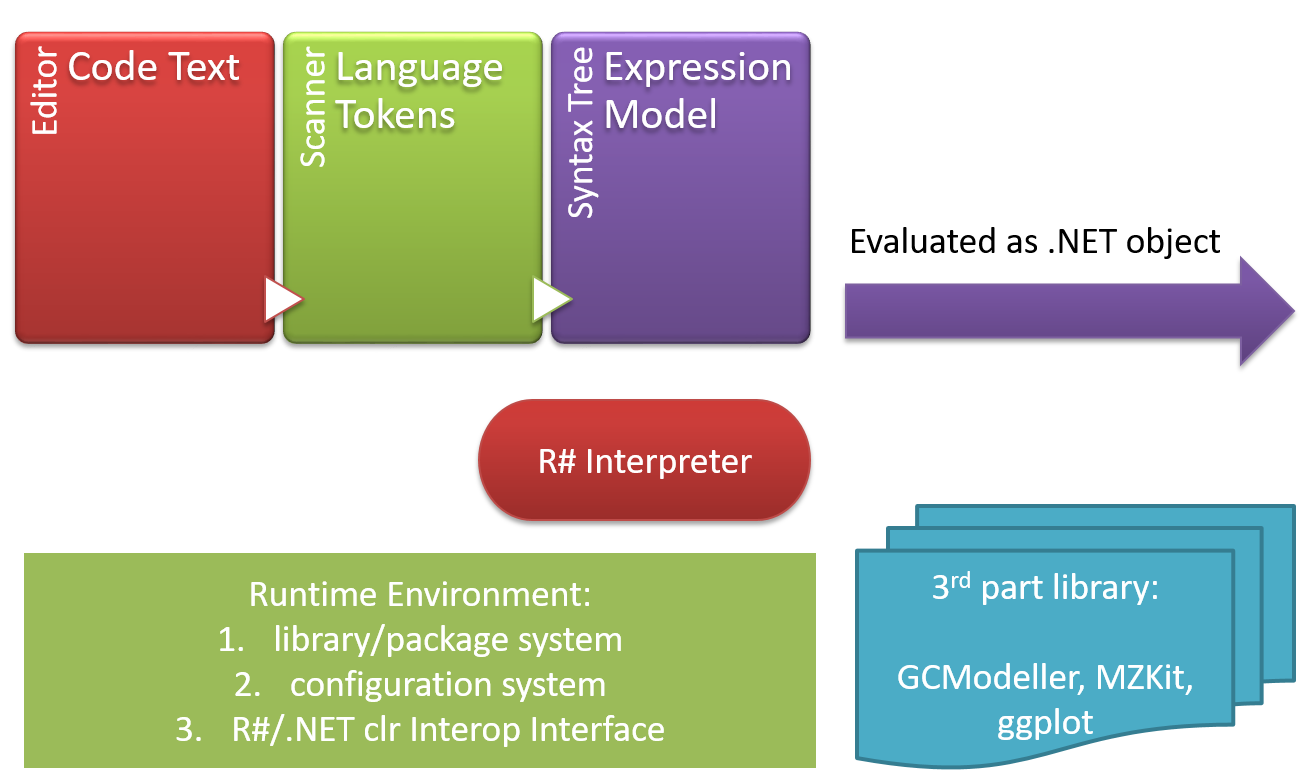 The R# language is a kind of interpreted programming language currently, and its interpreter is consists with 4 modules: