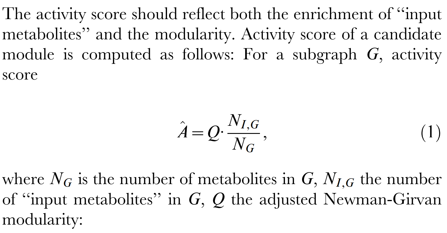 在这个方法之中,采用了一个很简单的富集得分计算方法来计算代谢途径生物共表达:使用属于某一个子图的candidate列表数量除以该子图的代谢物节点数量,再乘上整个网络结果的模块度值(关于网络模块度值的计算方法,大家可以阅读《基于Louvain算法的网络集群发现》了解算法细节)用来描述富集情况。很显然,我们的代谢物注释结果candidate列表越接近子图的代谢物节点数量,并且对应的模块度越高,则整个公式计算得到的富集得分越高,这说明注释得到的代谢物列表可能越准确。