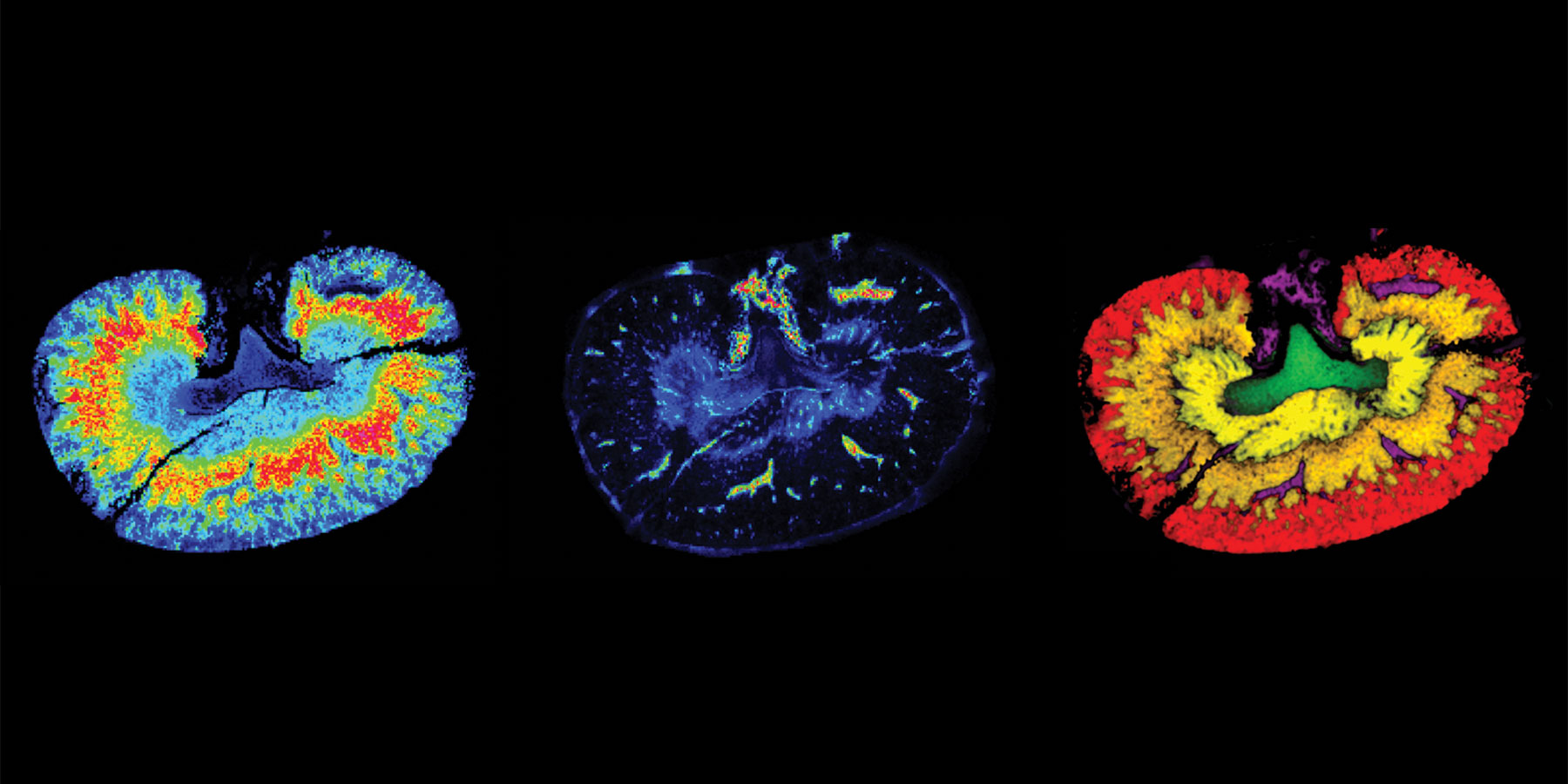 没错,上面的方法进行质谱成像可视化就是目前在杂志中经常出现的三原色离子叠加图。我们现在来挑选出三种离子,组合在一起进行三原色叠加,可以看见三种离子非常特异性的分布在了整个质谱成像图上的不同的部位区域之中。