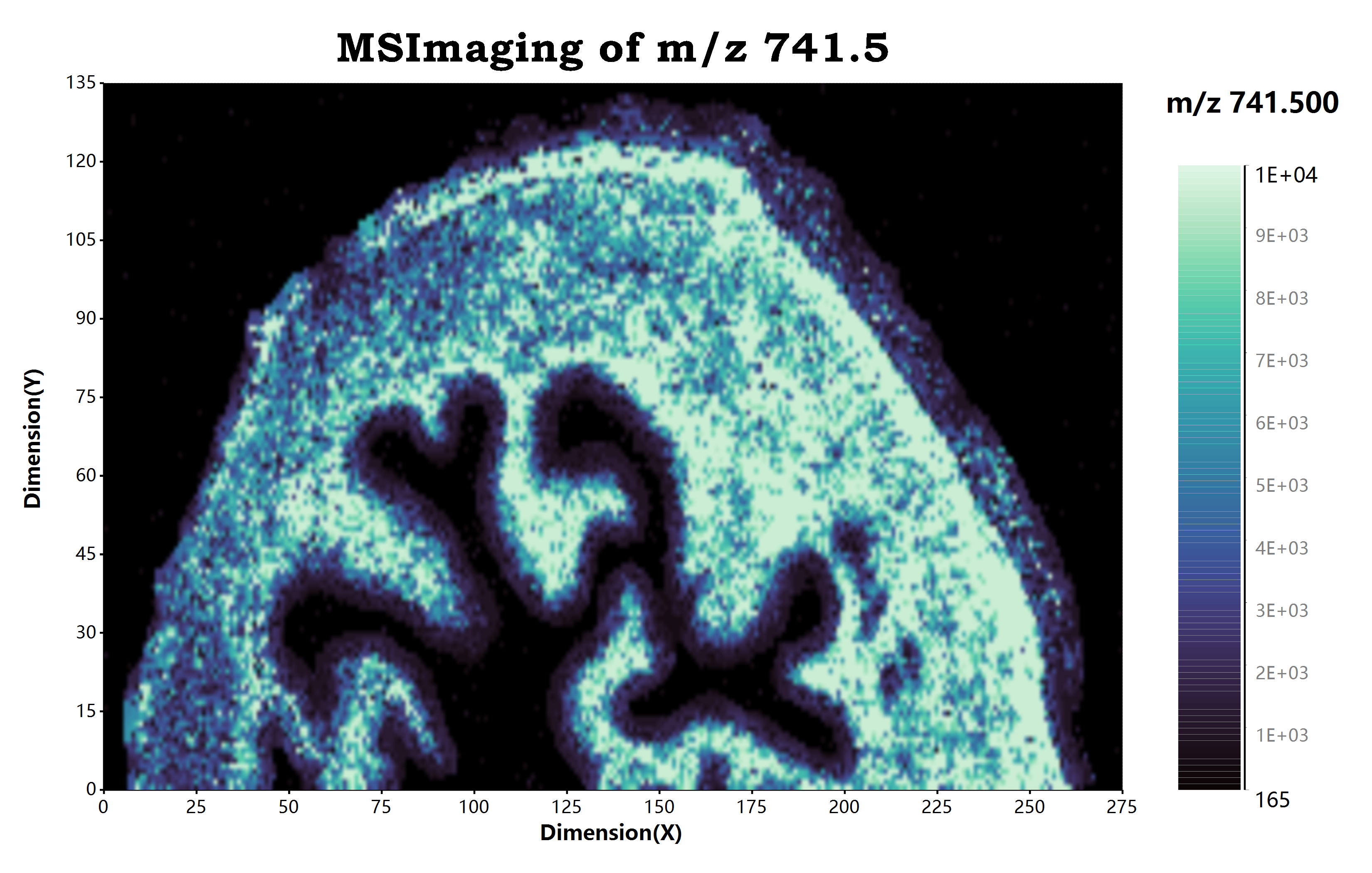 好的,最后对处理过后的信号数据进行质谱成像数据可视化,发现整个图像的对比度要比之前的结果要高上许多,整个结果图像也要清晰很多了。