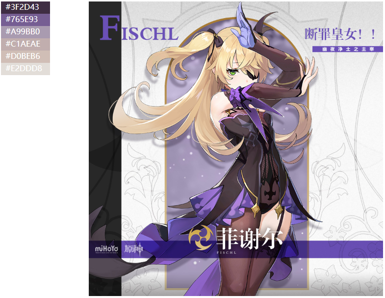 这样子,我们对上面得到的按照所出现的像素点数量进行降序排序的颜色列表,取出前6个这样子的颜色结果列表,就可以得到对应的原神角色主题色颜色版了。