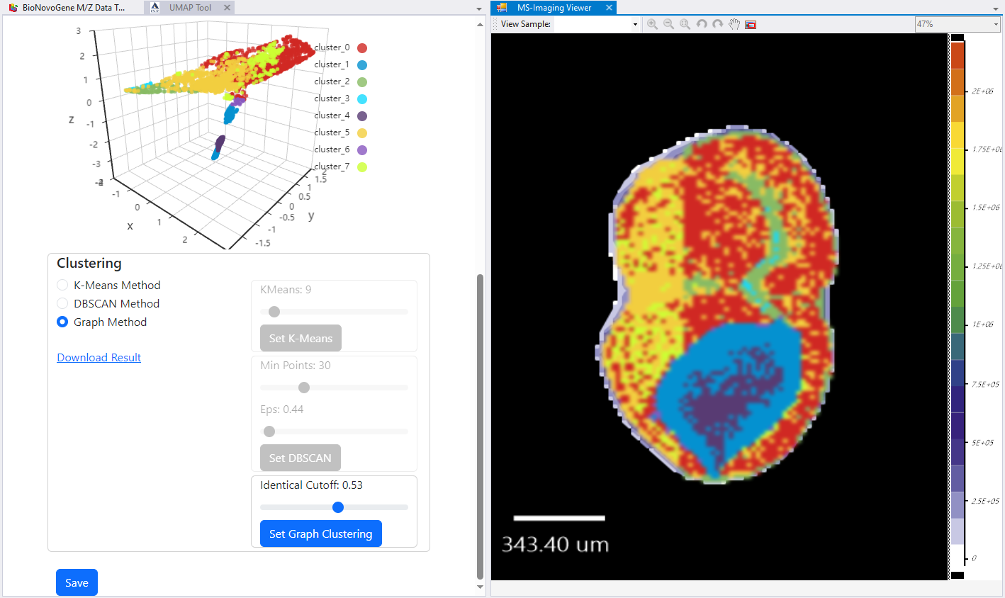 最后,完成了上面的操作后,我们只需要要点击【Save】按钮,将我们的聚类结果数据保存到空间代谢数据分析工作区中,即可查看到分区的可视化结果。如果需要将分区结果继续保存为文件,可以通过MZKit工作站的【Export Region】菜单进行保存。