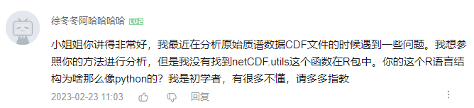 最近我在B站的视频页面下发现了这样的一条评论,面对质谱数据分析领域内的初学者的求教,其实自己也是非常的诚惶诚恐的。因为在视频中所使用的脚本语言是自己开发的一门新语言,所以可能给一些初学者造成了一部分的困扰哈哈😅😄😅😅。首先先对这个粉丝说一声抱歉哈。
