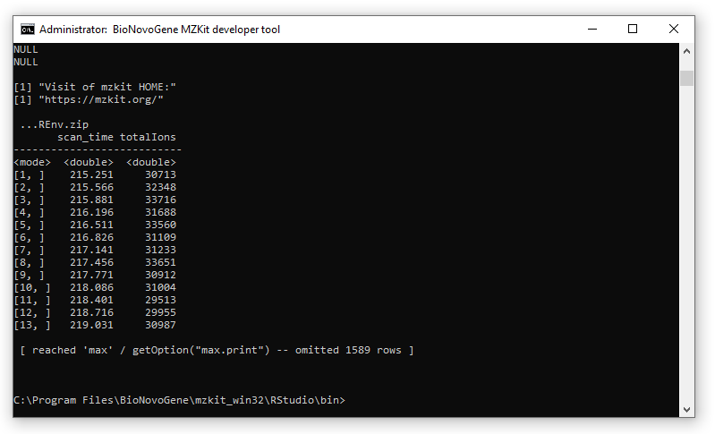 最起始的就是代表我们所使用的R#脚本的解释器程序,后面的路径就是我们上面所保存的R脚本了。现在在命令行上按下回车执行我们的脚本,经过一会儿之后,在我们的命令行窗口上应该会出现和下图类似的dataframe打印结果,出现这个就说明我们通过脚本从CDF文件之中读取总离子流色谱图相关的向量数据成功了!R#