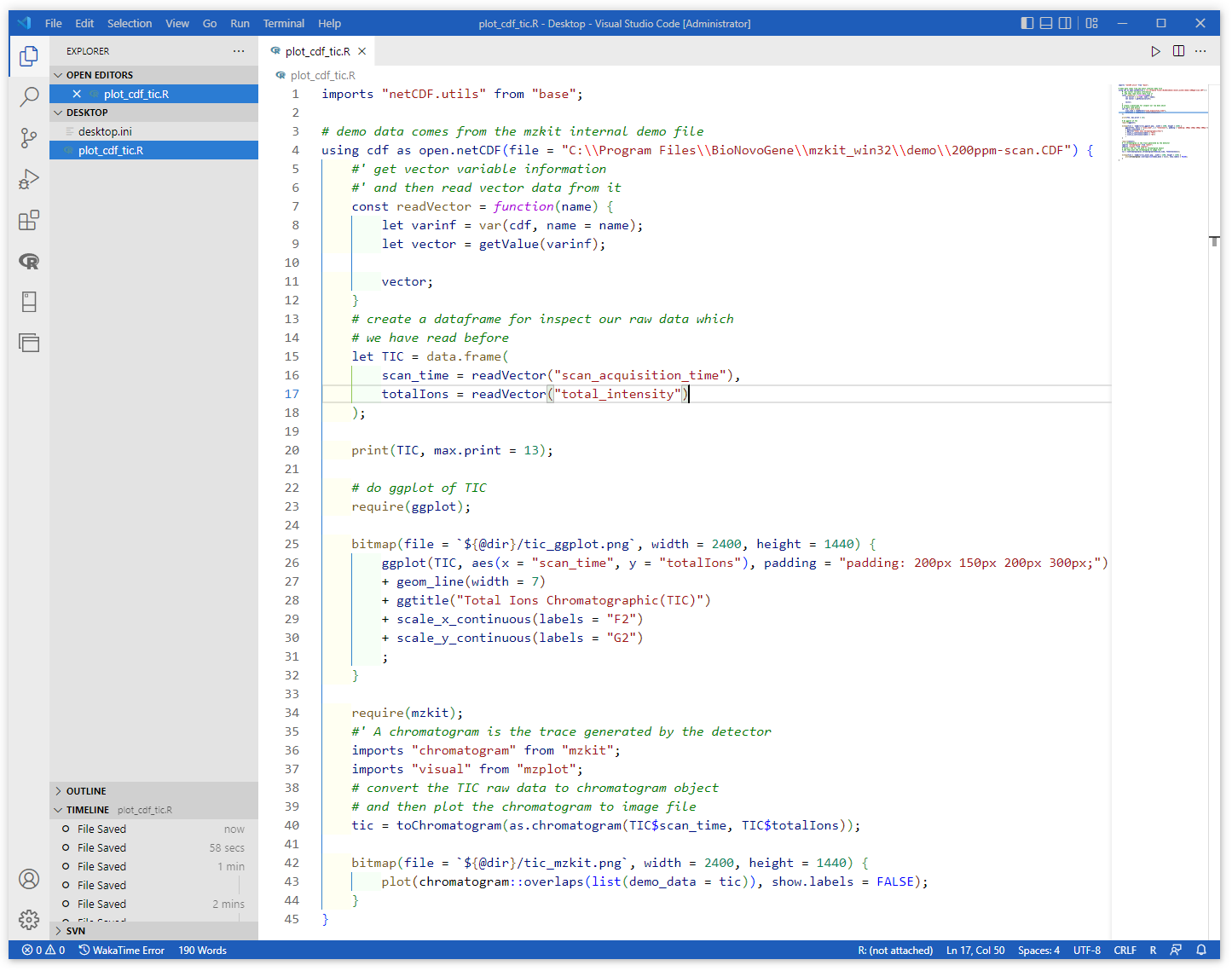 目前呢,经过多年的发展,MZKit开源项目目前在质谱原始数据处理相关领域内的应用其实已经比较广泛了:就帕诺米克而言,MZKit软件以及脚本编程语言已经非常广泛的应用于各种商业项目中的质谱原始数据处理的自动化流程搭建之中。那现在废话不多说,回到我们的正题:我们该如何通过R#编程语言脚本调用MZKit进行质谱数据的一些处理操作呢?假若读者已经安装有MZKit桌面工作站软件的话,实际上你已经获取得到了一个R#编程语言的运行环境:因为MZKit的一些数据分析功能和数据可视化功能是基于R#脚本语言编写的,R#语言编程环境已经集成在了MZKit桌面工作站软件之中了。R#