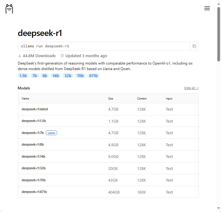 DeepSeek包含一系列不同的版本模型,我们在这里安装具有推理能力的deepseek-r1模型,deepseek-r1是DeepSeek的第一代推理模型,在数学、代码和推理任务上实现了与OpenAI-o1相媲美的性能。在ollama上,我们进入到deepseek-r1的模型页面上(https://ollama.com/library/deepseek-r1),可以看到不同参数尺寸规模的Deepseek-r1的模型列表。我们在这里选择一个大小和我们的显卡内存大小相近的模型,进行安装。
