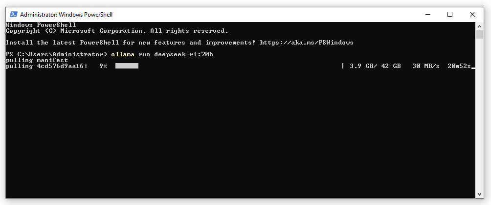 在这里我们以deepseek-r1:70b的模型为例来进行模型安装的讲解。假设我们现在已经安装好了ollama的客户端之后,打开系统的命令行界面,运行下面的命令即可执行模型的安装: